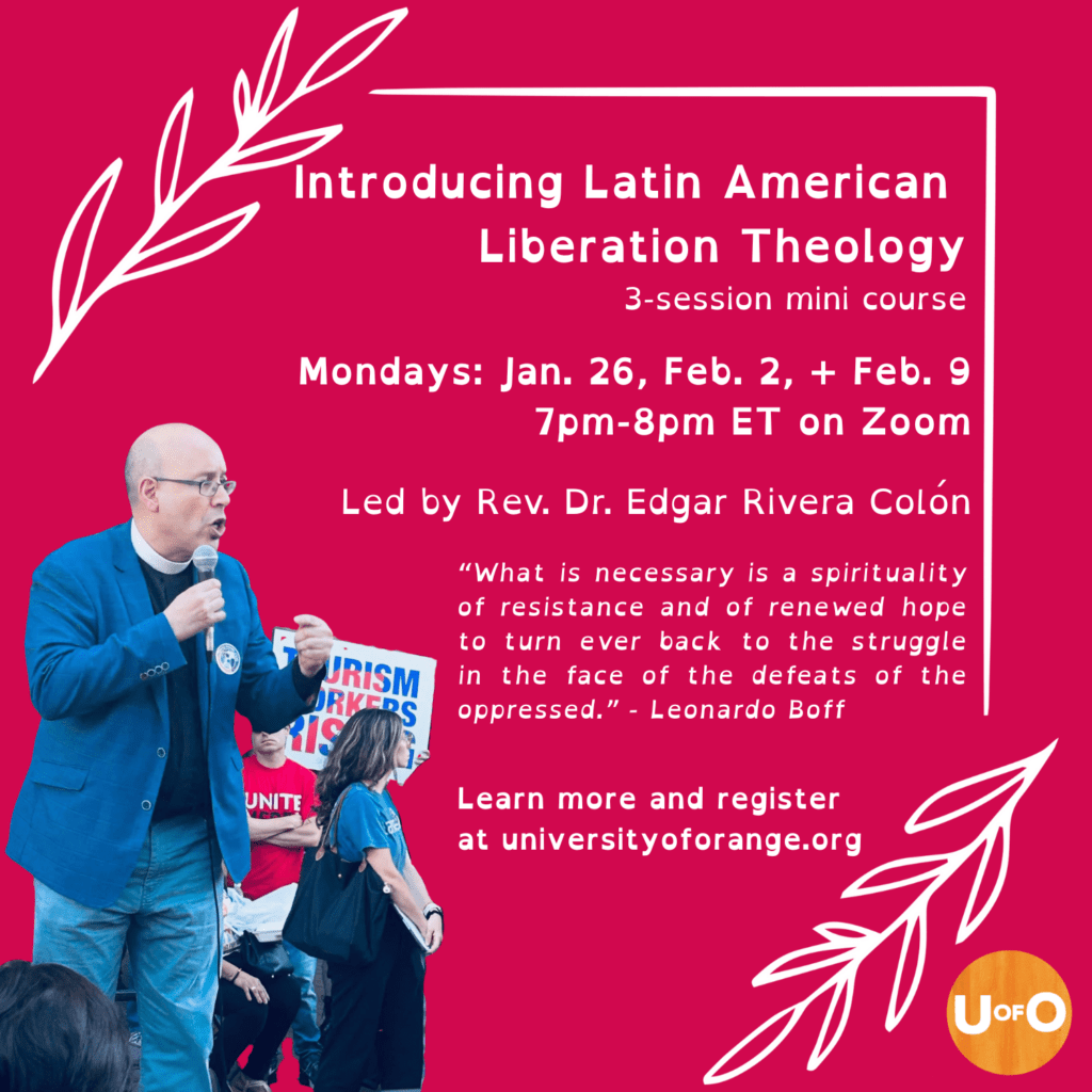 Introducing Latin American Liberation Theology 3-session Mini Course, Jan. 26, Feb. 2, + Feb. 9 7pm-8pm ET on Zoom Latin American Liberation Theology is one of the signal developments in spirituality and transformative politics in the post-WWII era. This three session mini-course will introduce the historical contexts, community practices, and basic concepts of Liberation Theology …