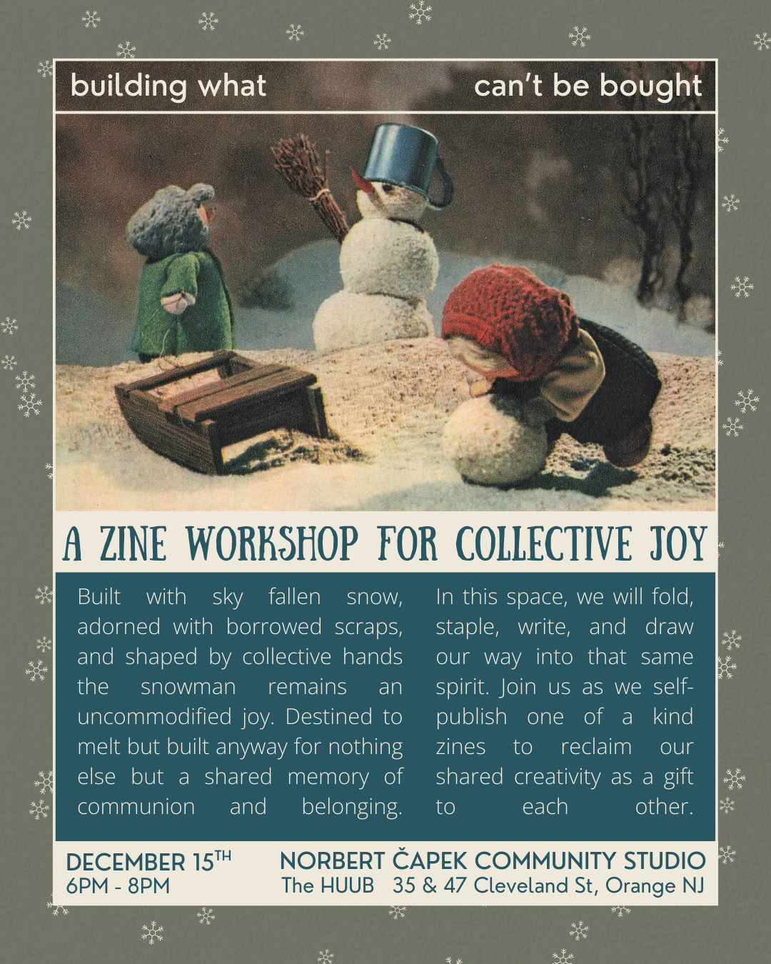 This month we will gather in the living room of Hale House (47 Cleveland St). During the potluck there will also be a “zine workshop for collective joy” in the newly reopened Norbert Capek Community Studio! The Norbert Capek Community Studio is a collective community art space in HUUB’s Hale House, named after former Faith+Works member and founder of the UU Flower Communion tradition. We look forward to holding more art activities and open studio days in the Capek Studio in the new year!