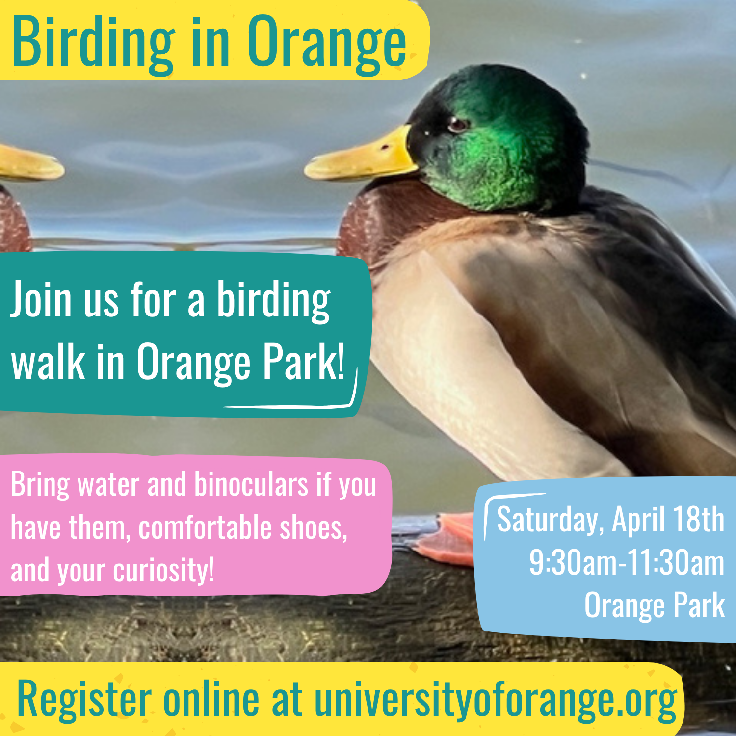 Join us for a birding walk in Orange! We will walk around Orange Park to see the park's resident birds and birds migrating through the area. Please wear comfortable shoes, bring water, and bring binoculars if you have them! The walk will be along a paved 1 mile path. Please REGISTER HERE!