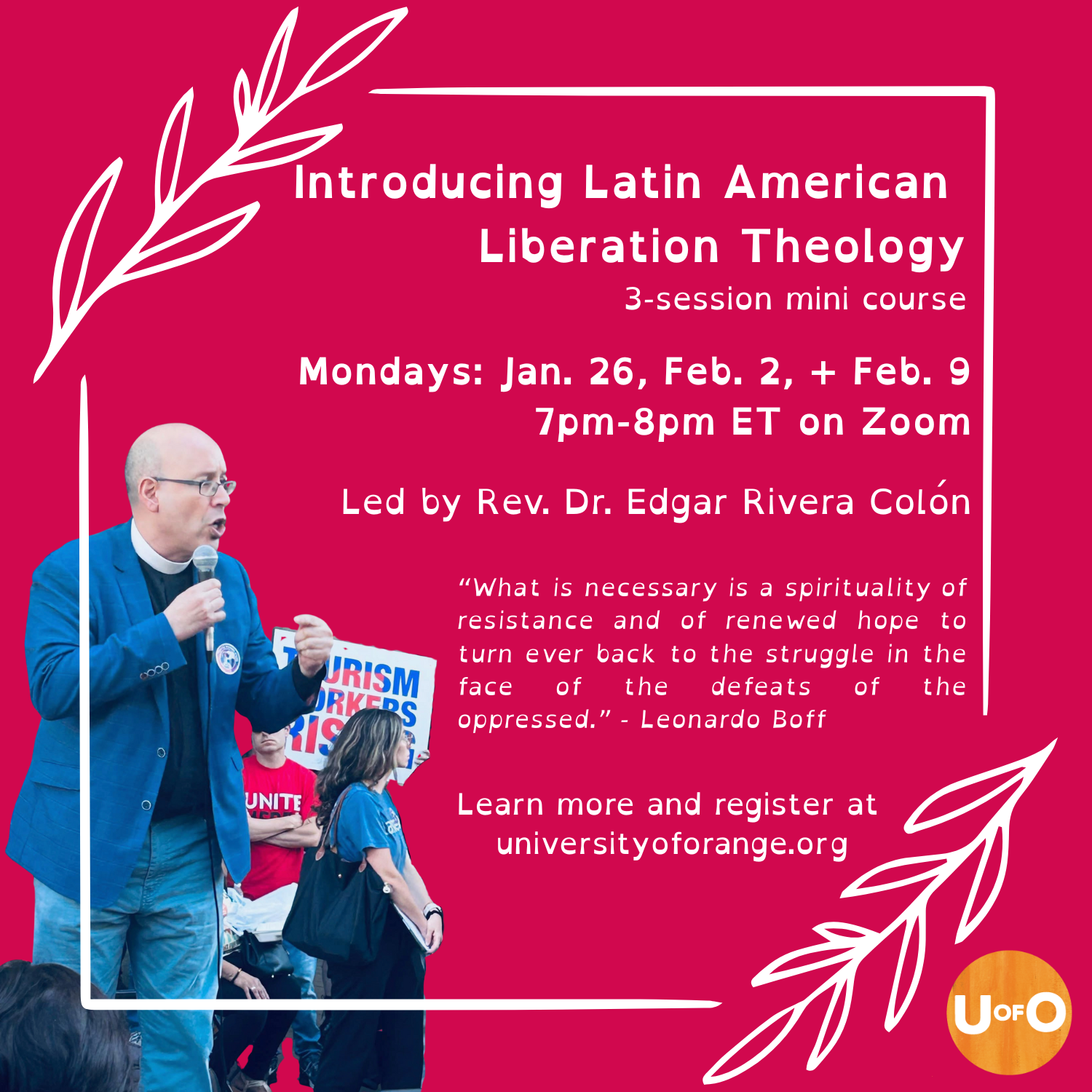 OnlineIntroducing Latin American Liberation Theology 3-session Mini Course, Jan. 26, Feb. 2, + Feb. 9 7pm-8pm ET on Zoom Latin American Liberation Theology is one of the signal developments in spirituality and transformative politics in the post-WWII era. This three session mini-course will introduce the historical contexts, community practices, and basic concepts of Liberation Theology …
